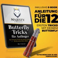 Ausgestattet ist der Butterfly Kamm mit einem Spring-Latch (federgestützter Verschluss) und einer Vernietung der Gelenkschrauben, sodass die Schrauben dort nicht nachgezogen werden müssen. Zum Lieferumfang gehört neben dem Butterfly Kamm noch ein passendes Nylon-Holster zur Aufbewahrung und ein E-Book zum Tricks lernen.