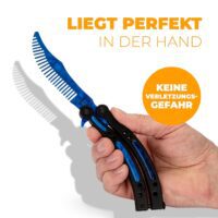 Der Butterfly Trainer in blau mit Kamm-Klinge gehört zur Reihe unserer markanten und optisch auffälligen Butterfly Trainer im CSGO-Stil. Mit seiner massiven Bauweise, der geschwungenen Griffstruktur und der blau schimmernden Kamm-Klinge (stumpf) sowie farblich passenden Akzenten auf den Griffelementen bietet er ein unverwechselbares, spielinspiriertes Erscheinungsbild – der schwarze Griff sorgt dabei für einen starken Kontrast.