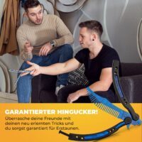 Die blau schimmernde Kamm-Klinge macht diesen Trainer zu einem echten Blickfang und setzt bewusst auf eine spielerische Optik – als humorvolles Design-Element, das gleichzeitig einen praktischen Vorteil bietet: Durch die Form lässt sich das Bite-Handle beim Flippen besonders gut erkennen. Dieses klare Feedback hilft vor allem Einsteigern, die Handposition sauber zu halten und Fehlgriffe zu vermeiden.