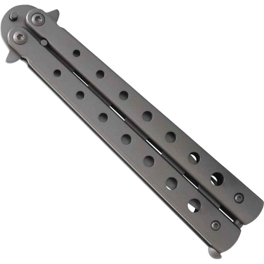 Dieser Butterfly Trainer aus dem Hause Haller ist ein schönes und schlichtgehaltenes Basic-Modell, das sich prima für Einsteiger eignet. Farblich ist das Butterfly Trainingsmesser im Titan-Finish bzw. mattgrau gehalten, sowohl die Griffe, als auch die stumpfe Klinge. Ausgestattet ist der Trainer mit einem normalen Latch (nicht federunterstützter Verschluss), als Einsteiger kannst du beim Flippen so allerdings gut lernen das Bite- und Safehandle auseinander zu halten.
